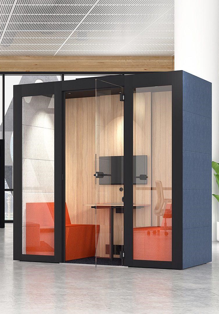 Een mooie open cabine die je laat deelnemen aan de omgeving, maar je toch voldoende rust geeft om geconcentreerd te kunnen werken. Deze akoestische ruimte is ook heel geschikt voor in bijvoorbeeld een restaurant of andere horecagelegenheid. Beschikbaar in verschillende afmetingen die plaats bieden tot 2, 4 of 6 personen. De kleur van de banken en de wanden is naar wens in te vullen zodat er altijd een stiltewerkplek ontstaat die past bij het interieur van jouw (bedrijfs)ruimte.